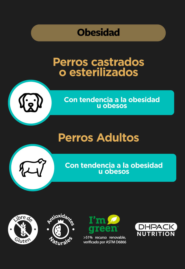 Agility Gold Obesos está formulado con proteínas altamente digestibles de origen animal que contribuyen al mantenimiento de una masa muscular óptima. Reducido en calorías y grasas sin afectar la palatabilidad del producto con niveles adecuados de fibra que generan sensación de saciedad en la mascota sin afectar su apetito. Contamos con la inclusión de L-Carnitina que favorece la movilización de grasas y musculatura magra. Sumado a la inclusión de prebióticos como la inulina que promueven el crecimiento de bacterias beneficiosas mejorando la digestión y fortaleciendo el sistema inmunológico.