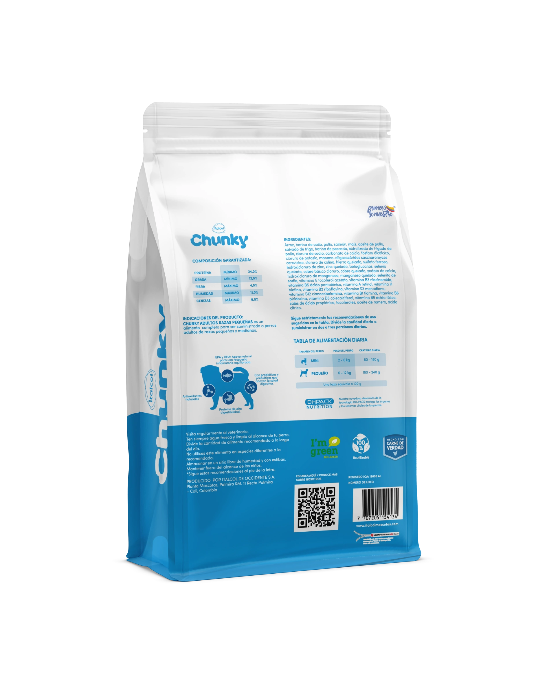 Arroz, harina de pollo, pollo, salmón, maíz, aceite de pollo, salvado de trigo, harina de pescado, hidrolizado de hígado de pollo, cloruro de sodio, carbonato de calcio, fosfato dicálcico, cloruro de potasio, Manano-oligosacaridos saccharomyces cerevisiae, betaglucanos, cloruro de colina, hierro quelado, sulfato ferroso, hidroxicloruro de zinc, zinc quelado, selenio quelado, cobre básico cloruro, cobre quelado, yodato de calcio, hidroxicloruro de manganeso, manganeso quelado, selenito de sodio, vitamina E tocoferol acetato, vitamina B3 niacinamida, vitamina B5 ácido pantoténico, vitamina A retinol, vitamina H biotina, vitamina B2 riboflavina, vitamina K3 menadiona, vitamina B12 cianocobalamina, vitamina B1 tiamina, vitamina B6 piridoxina, vitamina D3 colecalciferol, vitamina B9 ácido fólico, sales de ácido propiónico, tocoferoles, aceite de romero, ácido cítrico.