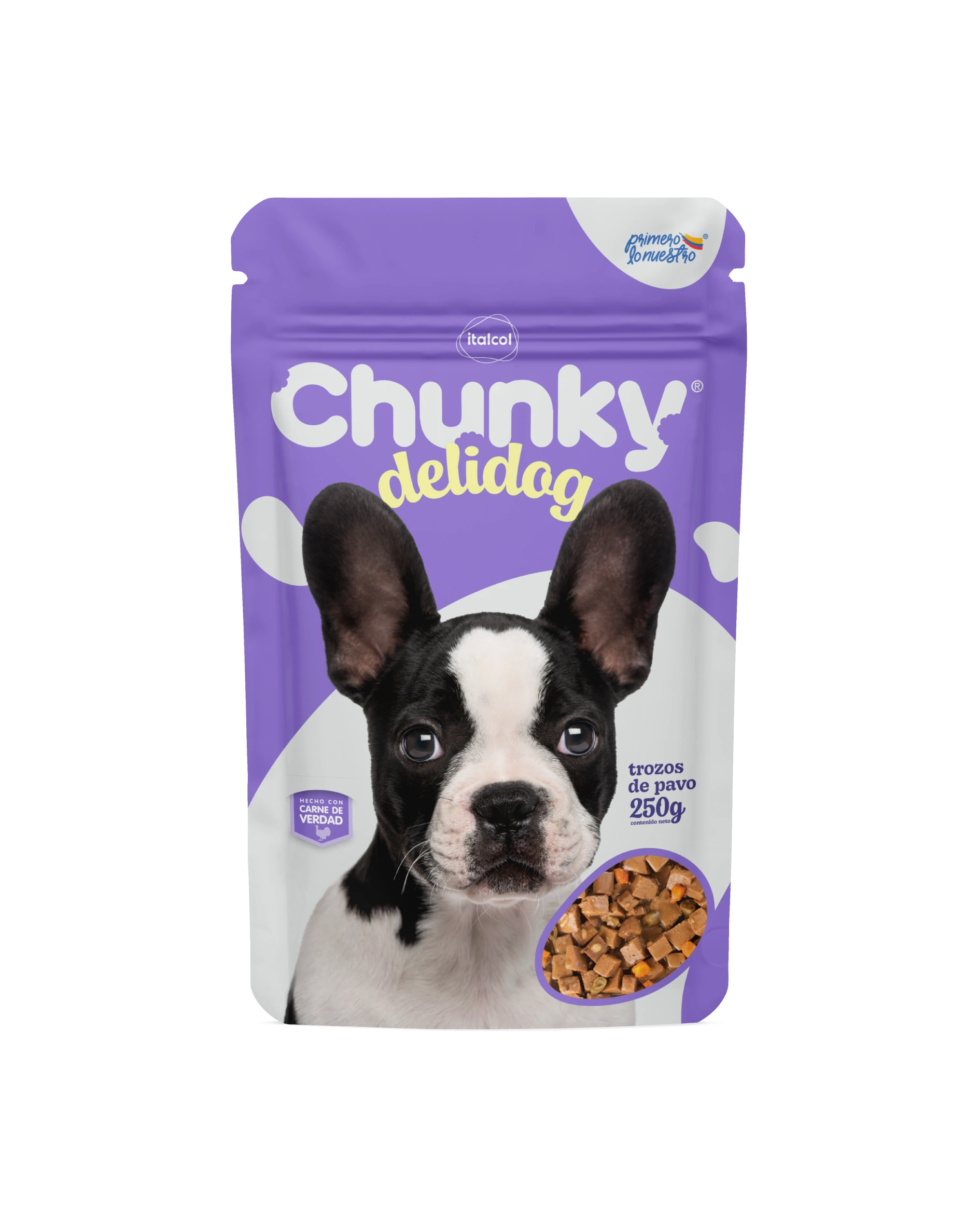 Agua, pasta de carne de pavo, hidrolizado de hígado de pollo, harina de trigo, aceite de pollo, mezcla de vegetales (habichuela y zanahoria) y arroz, proteína concentrada de soya, extracto de levadura saccharomyces cerevisiae, cloruro de sodio, polifosfato de sodio, ácido cítrico, goma guar, perejil deshidratado, cloruro de colina, hierro quelado, sulfato ferroso, hidroxicloruro de zinc, zinc quelado, beta-glucanos, selenio quelado, cobre básico cloruro, cobre quelado, yodato de calcio, hidroxicloruro de manganeso, manganeso quelado, selenito de sodio, vitamina E tocoferol acetato, vitamina B3 niacinamida, vitamina B5, vitamina A retinol, vitamina H biotina, vitamina B2 riboflavina, vitamina K3 menadiona, vitamina B12 cianocobalamina, vitamina B1 tiamina, vitamina B6 piridoxina, vitamina D3 colecalciferol, vitamina B9 ácido fólico, sales de ácido propiónico, tocoferoles, aceite de romero, ácido cítrico, color amarillo No 5.