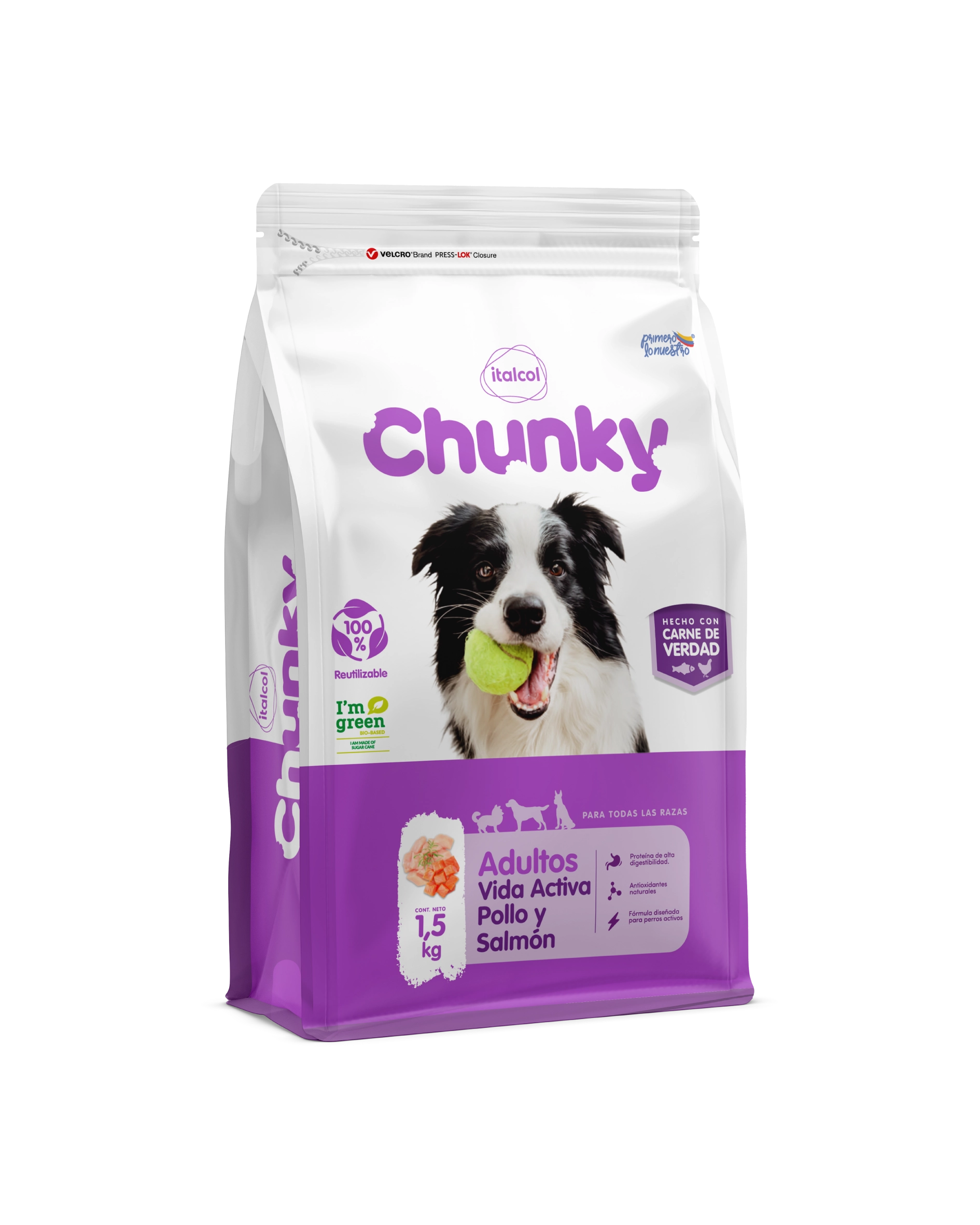 Pollo, arroz, harina de pollo, salmón, maíz, aceite de pollo, salvado de trigo, harina de pescado, hidrolizado de hígado de pollo, cloruro de sodio, carbonato de calcio, fosfato dicálcico, cloruro de potasio, manano-oligosacaridos saccharomyces cerevisiae, betaglucanos, cloruro de colina, hierro quelado, sulfato ferroso, hidroxicloruro de zinc, zinc quelado, selenio quelado, cobre básico cloruro, cobre quelado, yodato de calcio, hidroxicloruro de manganeso, manganeso quelado, selenito de sodio, vitamina E tocoferol acetato, vitamina B3 niacinamida, vitamina B5 ácido pantoténico, vitamina A retinol, vitamina H biotina, vitamina B2 riboflavina, vitamina K3 menadiona, vitamina B12 cianocobalamina, vitamina B1 tiamina, vitamina B6 piridoxina, vitamina D3 colecalciferol, vitamina B9 ácido fólico, sales de ácido propiónico, tocoferoles, aceite de romero, ácido cítrico.